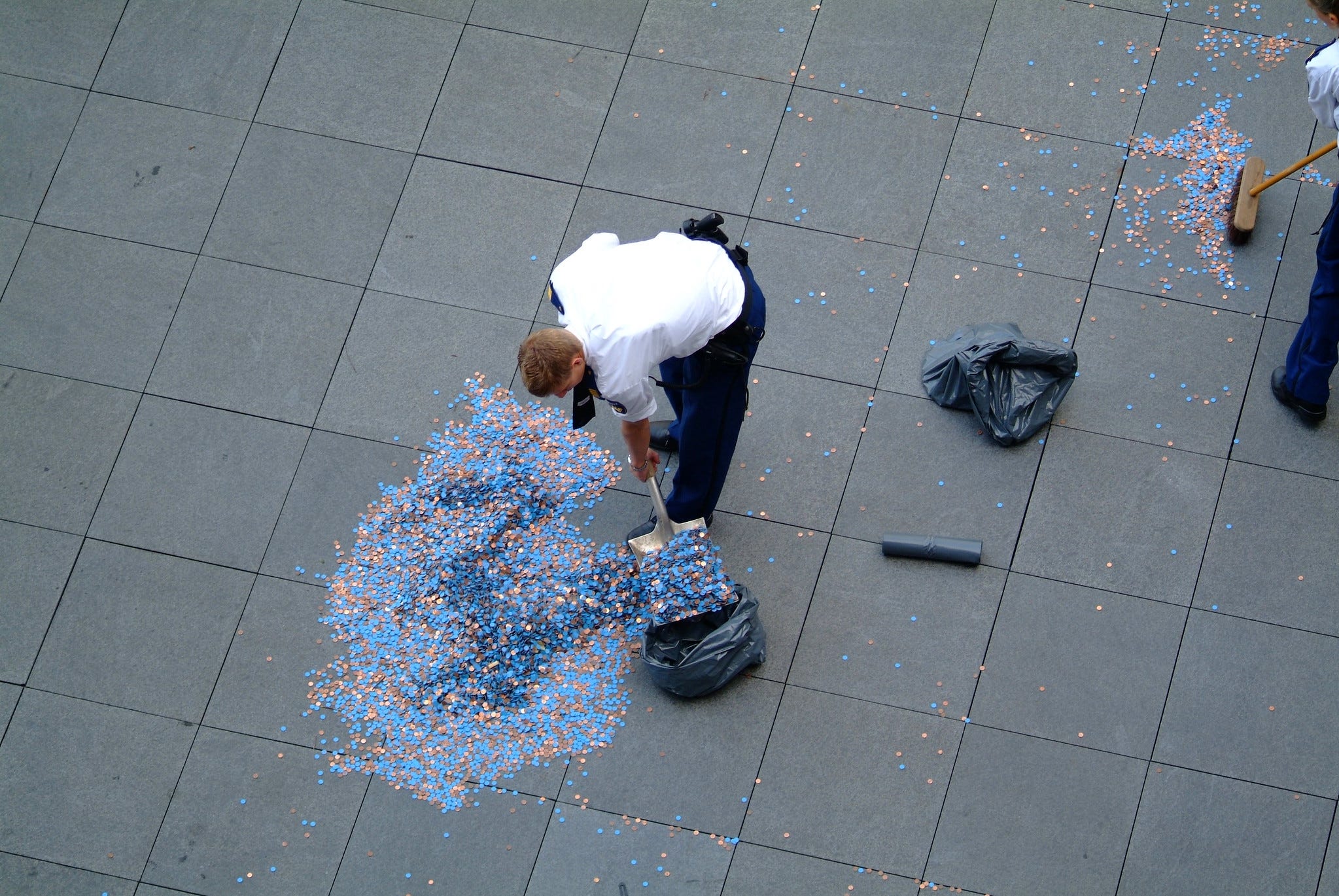Sembra che la polizia di Amsterdam sia stata chiamata da un cittadino per denunciare il presunto "furto di un'opera d'arte". Secondo la storia, le persone stavano raccogliendo alcune monete, come previsto nel progetto, ma le cose sono sfuggite di mano. La polizia, rispondendo alla segnalazione di furto di rame, si è recata sul luogo, dove gran parte delle monete era ancora al suo posto. Tuttavia, non era chiaro chi fosse il proprietario del denaro e perché le monete fossero sparse nel parco. Per preservare il denaro da possibili malintenzionati, in collaborazione con il servizio calamità del comune, la polizia ha raccolto tutte le monete rimaste e le ha depositate presso un loro ufficio.