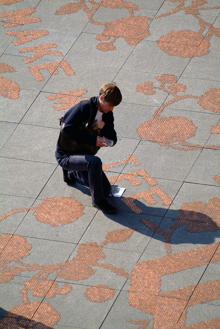 L'opera di Sagmeister, in un contesto in cui gli interventi urbani cercano di impedire alterazioni da parte del pubblico, diventa un pezzo potenzialmente autodistruttivo. Le monete rappresentano un certo valore, ma anche il disegno è di una bellezza tale da sfidare il passante. Lo lasceranno intatto per la sua bellezza? Inizieranno a realizzare un disegno con i centesimi stessi? L'avidità prenderà il sopravvento?"